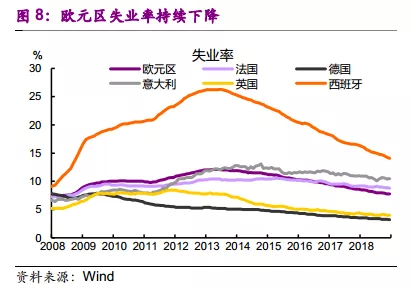 与经济增长波动起伏不同的是,欧洲劳动力市场处于持续好转路径中。自2012年欧债危机之后,欧洲的失业率一直处于下降通道,至2018年12月,欧元区的失业率已下降至7.9%,较2013年高点下滑近4.2个百分点。英国的失业率一直低于欧元区整体,2018年12月已落至4%,低于其次债危机前的水平,甚至是30年来的低点(图8)。当年的“欧猪五国”,失业率也开始下滑,以西班牙为例,2018年其失业率明显下降,2018年12月失业率为14.3%,同比减少2.2个百分点,比2013年的高点下降了11.9个百分点。