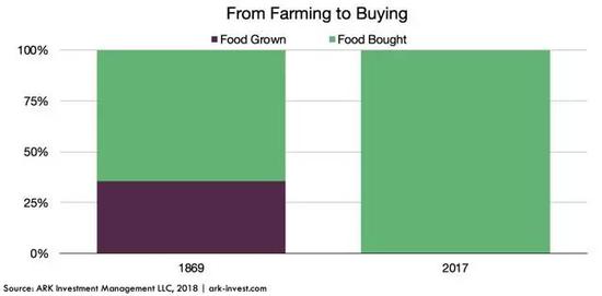 甚至在互联网出现之前,技术就已经是食品行业一个重要的变革推动者。由于工业化农业的发展,美国从事食品生产的劳动力比例从18世纪的90%以上下降到今天的不到10%。在消费方面,自产食品的比例已经从150年前的33%下降到今天的不足1%,如下图所示。随着农业的工业化,粮食生产的规模和效率有了显著的提高,消除了数千年来一直存在的个体农业的杂务。