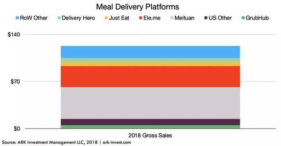 尽管这种模式相对较新,但在线送餐平台在全球的食品总销售额已经达到1200亿美元,如下图所示。与过去互联网支持的商业模式不同,中国(而非美国)在送餐服务方面遥遥领先。Meituan和避署。me (ELEME)每年的总销售额接近800亿美元,占全球市场份额的64%。相比之下,美国市场领导者Grubhub仅贡献了50亿美元。
