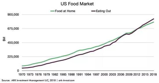 正如他们当时不想当农民一样,如今大多数人也不想做饭:《哈佛商业评论》(HBR)的一项研究显示,大约90%的美国人要么讨厌做饭,要么对做饭感到矛盾。因此,现代餐饮业在2018年的收入基础已经达到8300亿美元,如下图所示。如今,美国人花在“外出就餐”上的钱比花在购买杂货上的钱还要多。即使没有技术的帮助,至少目前还没有,便利已经战胜了成本,在这个过程中创造了一个更大的市场。