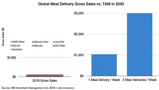 如上图所示,如果2030年每周有28亿消费者以平均每餐7美元的价格享用一次送餐服务,这个市场的年规模将扩大近10倍,达到约1万亿美元。如果领养人数达到每周三顿饭,市场规模将达到3万亿美元。有趣的是,美团的用户已经通过这项服务每周订购超过三次,这表明我们的估计可能过于保守。换句话说,相对于它的长期机遇,这个1200亿美元的全球外卖市场目前的潜在渗透率仅为4%,还处于萌芽阶段。