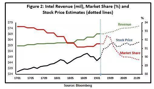 由于大多数股票的价格主要取决于未来的收入增长率,市场份额的变化表明,如果总“馅饼”是固定的,竞争对手之间的权衡将成为最重要的因素。也就是说,股价对市场份额的变化比收入增长率更敏感。这个想法的“数学”似乎很直观。假设整个市场份额将增长10%,但英特尔将失去3%的市场份额给AMD,英特尔应该只能获得约7%的增长。