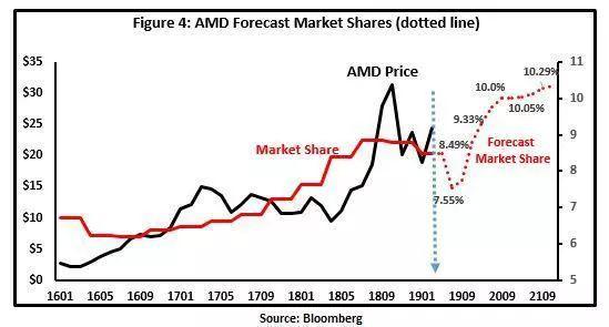如果营收和市场份额是英特尔和AMD的重要指标,我将利用分析师对英特尔和AMD营收的普遍预估,预估两家公司未来12个季度的营收市场份额。在上面的图2中,英特尔的市场份额预计将在2019年第二季度左右增长到92.5%,这是由于AMD在加密背景下失去了市场份额。明年,这一比例将下降到90%以下。假设AMD的EPYC服务器市场份额最终会达到Su博士预测的两位数。从上一篇文章中可以看出,图4显示AMD未来的市场份额出现了相反的变化。尽管如此,从图2中得到的一个重要信息是,英特尔未来的股价显然与估计的收入相关,但与估计的市场份额无关。