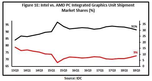 股票市场似乎固守着市场份额的概念。由于英特尔的规模是AMD的10倍,同样的营收变动将使规模较小的AMD的市场份额变动更大,其股价对市场份额变动更为敏感。自从AMD推出Ryzen、Threadripper和EYPC以来,英特尔在所有领域的市场份额都在稳步输给AMD。在图1A中,英特尔的PC收入份额从2017年第三季度的95.3%下降到了2018年第三季度的94.2%。最近类似的下降可以在所有应用程序中验证(图1b -图1E)。显然,英特尔在移动、桌面和服务器终端用户的收入和出货量方面都取得了市场份额的增长。尽管IDC数据停止在2018年第三季度,我应该指出,AMD的估计收入和单位出售的所有部分都将显著减少1 h 2019由于crypto-related需求的影响(图2)。至于最受关注的和有利可图的服务器部分,由于EPYC那不勒斯和罗马,AMD的市场份额最终打破了0和2018年第三季度和第四季度的3.2%上升至1.5%(图1 d)。