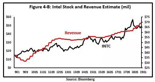 我在这里想说的重点是,收入水平和收入增长与英特尔股价的关系都比与英特尔市场份额的关系更密切。看来,至少在英特尔的案例中,在CPU领域对AMD的市场份额并不是英特尔股价走势的主要驱动因素。