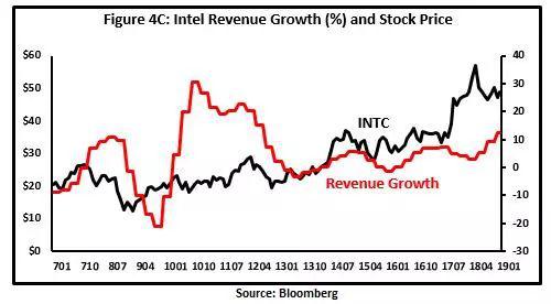 由于对本文的兴趣是关于英特尔的,通过研究英特尔收入增长、市场份额和股价之间的历史关系,可以很容易地观察到收入相关性的论点。从下图中可以明显看出,英特尔的股价变化更多的是与收入水平(图4B)和收入增长(图4C)相关,而不是与市场份额变化(图4)相关。