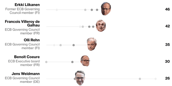 德拉吉的其他潜在接班人包括法国央行行长弗朗索瓦-维勒罗伊-德加尔豪(Francois Villeroy de Galhau)、欧洲央行执行董事会成员伯努瓦-克莱(Benoit Coeure)、芬兰央行行长奥利-雷恩(Olli Rehn)以及他的前任埃尔基-利卡宁(Erkki Liikanen)。