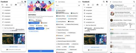 Facebook会推荐你的个人爱好,例如打球,看书,打游戏等等,此外还能根据自身情况来自定义添加爱好。据悉这家社交网络巨头正在研发约会功能,在引入爱好选项之后能够帮助你更快找到有公共兴趣爱好的约会对象。