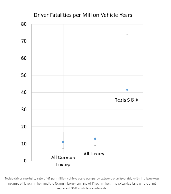 虽然马斯克喜欢吹捧特斯拉电动车非常好的碰撞测试评级,但与其他豪华汽车制造商相比,特斯拉电动车的死亡率高得不成比例。