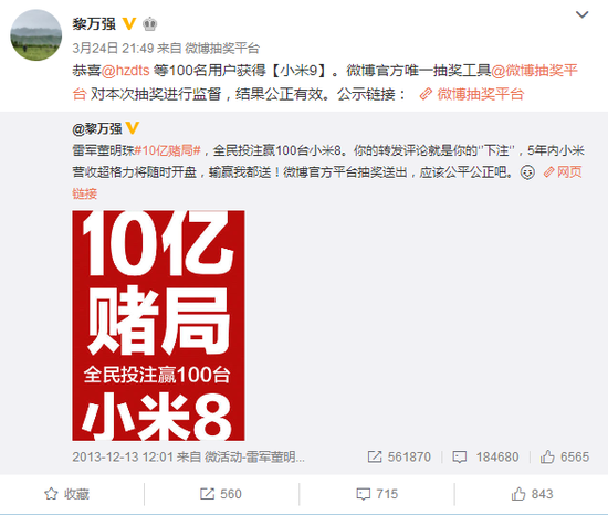 新浪财经讯 3月25日消息,昨日晚间,小米的联合创始人黎万强公布当初雷军董明珠10亿赌局的微博抽奖活动获奖名单,共100名用户各获得小米9手机一台。