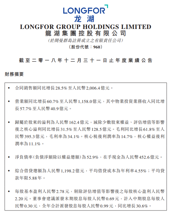新浪港股讯 龙湖集团(00960.HK)发布公告,截至2018年12月31日止年度,公司实现营业额1158.0亿元人民币(单位下同),同比增长60.7%;股东应占利润162.4亿元,同比增长28.8%;每股基本盈利2.78元;拟派末期股息每股0.69元。