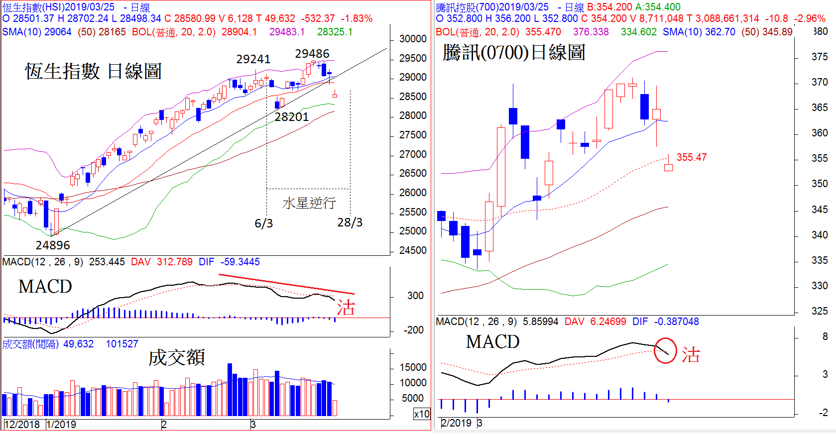 3月20日本欄指出:「假如跌至29241的頂部支持之下低收,則表示近幾日的向上突破只屬於『假突破』(『水星逆行』期間常見的現象),繼而增加短線見頂的機會。另外,從成交的角度看,近日恆指雖然迭創新高,一浪高於一浪,但成交額卻持續縮減,顯示大市的上升動力正在減退,是營造頂部的先兆。」