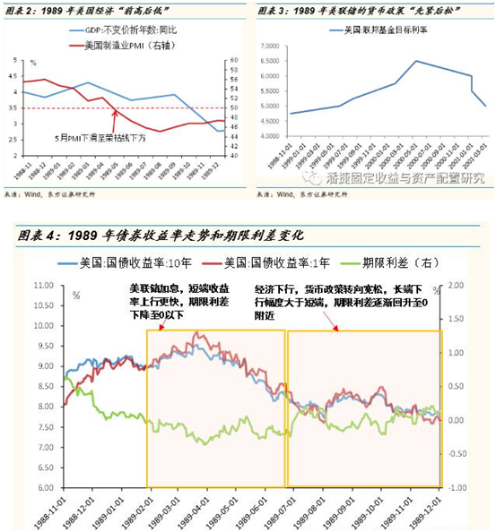 1987年11月至1988年2月,美联储连续3次降息后,经济出现了复苏,同时通胀抬头。为抑制高通胀风险,美联储于1988年3月开始至1989年6月连续加息17次。过快的加息使得美国经济重新陷入衰退,1989年1月底至10月底,美国国债的期限利差长期倒挂,随后美国在1989年至1991年陷入一轮经济衰退,1992年才开始逐渐走出危机。
