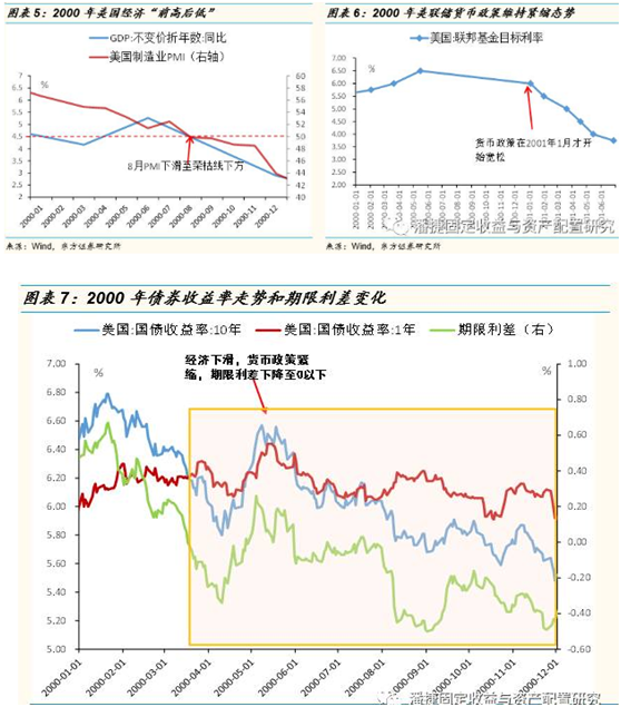 2000年上半年,美国经济表现相对稳健,GDP同比增长率较前期有所提升,制造业和非制造PMI虽显著高于荣枯线,但已有下滑趋势。期限利差出现倒挂之后,伴随着“互联网泡沫”的破灭,美国经济开始逐渐向“衰退”转变,制造业PMI于2000年8月降至荣枯线以下,经济进入新一轮衰退期。期间股市也连续下挫,至“9•11”事件前夕,纳斯达克指数大跌了31%。