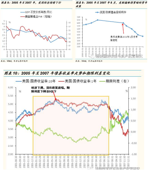 造成当时收益率曲线倒挂的原因主要有两点,一是在长达两年的加息后,联邦基金利率被维持在较高的水平(5.25%),资金面偏紧,短端收益率处于高位;二是随着经济增速下行,通胀水平不高,长端收益率在预期的推动下出现下行。