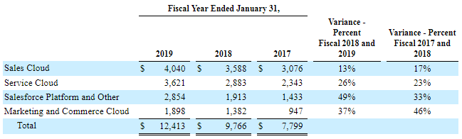 Saleforce平台业务占比约达23%,因年化增长率超31%成为增长最快的分部。该分部主要为开发者及企业用户集成及管理企业应用。18年5月随着对MuleSoft的收购,订阅用户得以利用现有网络连接至任意系统、应用或设备。目前,该公司的创收贡献还有较大挖掘空间,19财年仅贡献约3.6亿美元,相比29亿的分部收入来说比较小。