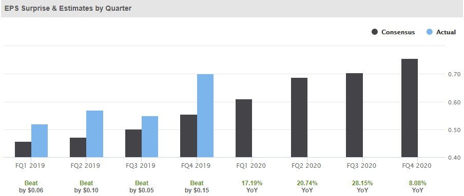 刚结束的19财年利润占总营收比例达到74%。过去五年,公司营收年化增速达19.7%,盈利年化增速却达到19.21%,相比几乎持平。看支出项,营收成本年化增速略低于22%,研发与运营开支比例稳定在20%的水平。受益于税改,摊薄EPS同比大增192%至1.43美元。19财年四个季度EPS均超分析师预期,且近3个季度分析师预计同比增速将近20%。