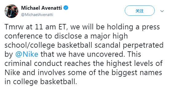 不到一小时前,阿文纳蒂发推文称,他将于周二上午召开新闻发布会,披露“@耐克(nike)在高中/大学犯下的一起重大篮球丑闻”。