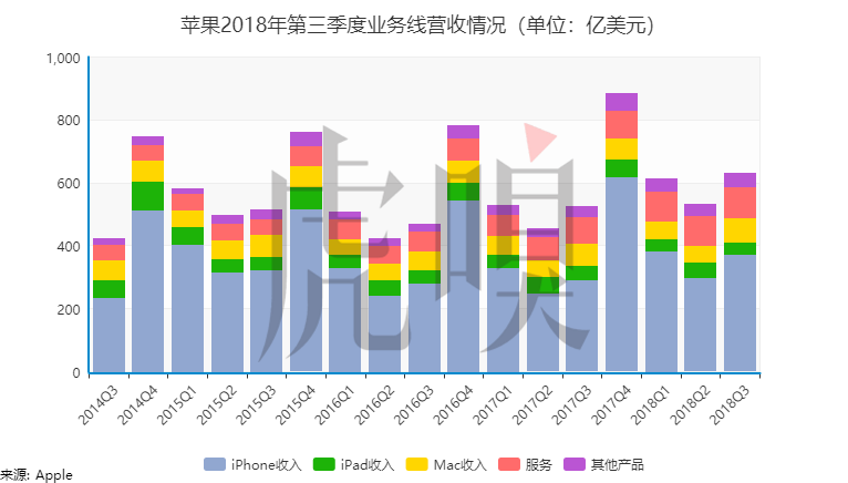2018 第四财季,苹果整体营收629亿美元,同比增幅19.6%。但所有业务线中,依旧是iPhone收入当顶梁柱。第三季度iPhone贡献371.85亿美元,Mac和iPad产品线分别贡献了74.11亿美元和40.89亿美元。服务收入进一步增长,达到99.81亿美元。