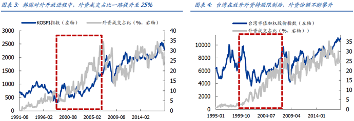 台湾和韩国资本市场的对外开放,都起始于上个世纪90年代。1991-2000年间,台湾当局逐渐放松了外资对岛内投资的各类限制性政策,至2000年底全面取消外资持股比例上限。随后8年内,台湾市场外资持股比例飞速上行,从01年的8.8%迅速提升至07年的25%,韩国资本市场对外开放的进程与台湾大体相似,自92年起逐步放开外资投资限制,至2000年全面取消外资投资额度,随后的8年内韩国市场外资成交占比一路从1%提升至10%。