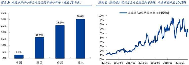 随着我国资本市场对外开放全面提速,国际资本的进入渠道不断拓宽。经济工作会议着重强调引入中长线资金入市,年初QFII额度扩容体现了官方继续扩大对外开放的姿态。2018年瑞信亚洲投资会议中,上交所高层表态着手改善海外投资者市场准入,计划三年内将外资持有A股比例提高10%,将外资交易占比提升至15%,若外资持股比例达到10%,则意味着给A股带来约4万亿的增量资金。
