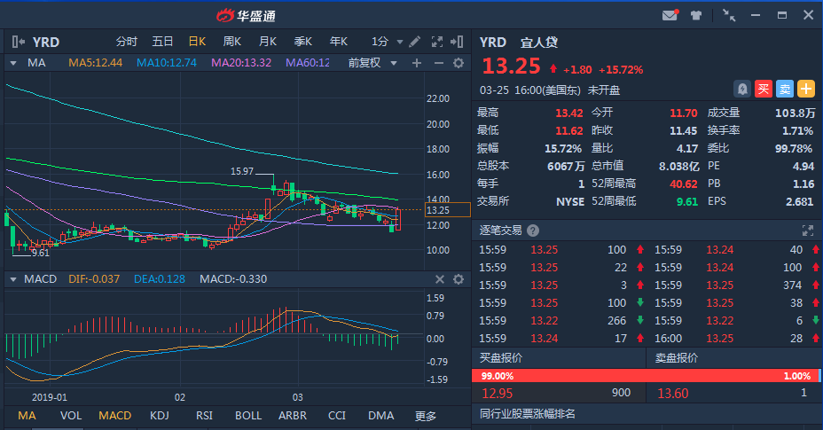 不过,值得一提的是,昨日宜人贷股价并没受2018年业绩不佳的情况影响,反而大涨15.72%,收报13.25美元,最新市值为8.039亿美元。
