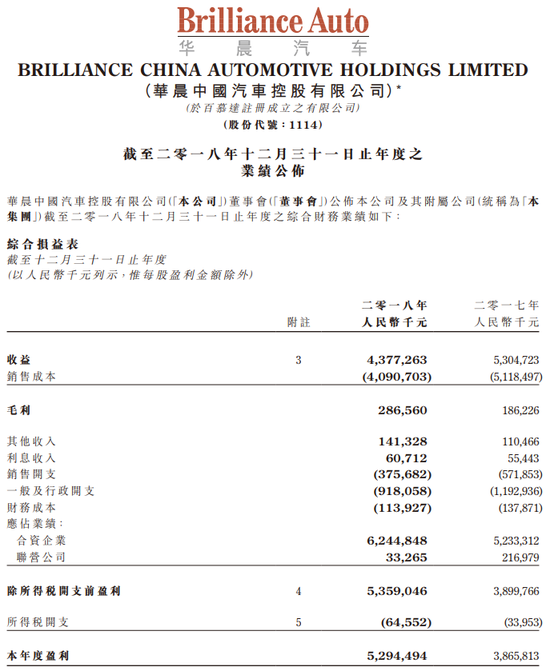 公告表示,2018年度,集团综合收益(主要来自集团主要营运附属公司华晨雷诺、沈阳兴远东汽车零部件有限公司及华晨东亚汽车金融)为43.77亿元,同比下跌17.5%。在该等数据中,华晨东亚汽车金融于2018年提供汽车金融服务所得收益为3.77亿元,较去年呈报高出167.8%。集团2018年度综合收益下跌,主要由于年内轻型客车及MPV销量减少。