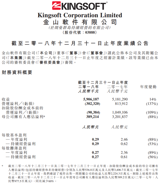 2018年度及2017年度扣除股份酬金成本前的母公司拥有人应占溢利分别为5.37亿元及34亿元。2017年度,该公司确认了视作出售一间附属公司的收益22.24亿元。剔除上述视作出售收益,2018年度母公司拥有人应占溢利为3.89亿元,同比减少60%。