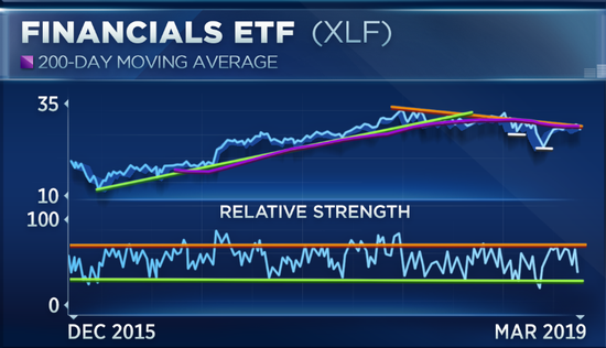 他在周五CNBC节目“Trading Nation” 上说,目前仍然看空金融股,将这一板块评级为减持。这一板块最近的低点越来越低,高点也越来越低,在他看来,金融板块自从去年12月以来的上涨不过是一次超跌反弹。