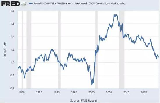 从1980年到1988年,价值略微超过增长。从1988年到2000年,增长略高于价值。从2000年到2007年,价值远超过增长。从2007年到现在,增长适度超过了价值。