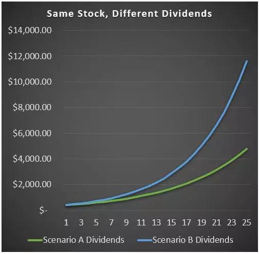 如果两种情景中的投资者每年不断增加新的资金,这将进一步放大。如果每个人每年都把钱放到更多的股票中,那么情景B中的投资者就会赚更多,因为她每年以相同的金额购买两倍的股票,而且股息还能累积更多股票。