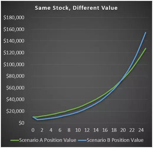 以下是两种情景的投资组合价值图表。从第20年开始,情景B的美元价值赶上并超过情景A: