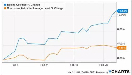 2019年1月,波音股价上涨14%,而2018年12月涨幅为20%。波音的股价明显好于道琼斯指数,后者涨幅超过3%。
