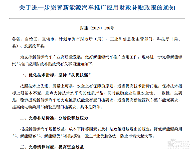 车东西消息,千呼万唤始出来,2019新能源车补贴新政终于出台。