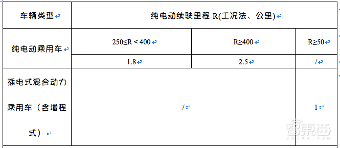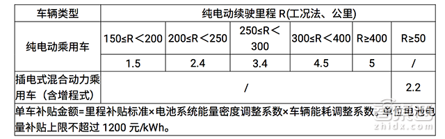 注:纯电动乘用车单车补贴金额=Min{里程补贴标准,车辆带电量×550元}×电池系统能量密度调整系数×车辆能耗调整系数。