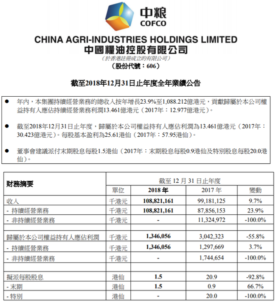 新浪港股讯 中国粮油控股发布公告,截至2018年12月31日止年度,公司持续经营业务的总收入按年增长23.9%至1088.212亿港元;归属于公司权益持有人应占利润同比减少55.76%至13.461亿港元;每股基本盈利为25.61港仙;末期股息每股1.5港仙。