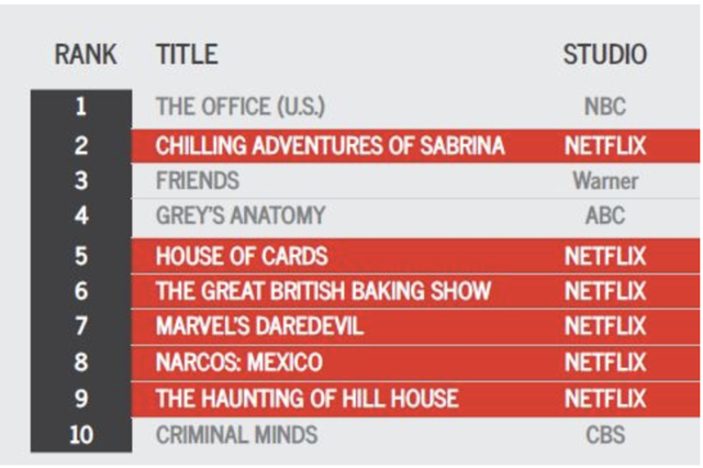 下图可见,前4个观看次数最多的节目中,有3个都不是奈飞制作,现在反而会成为隐患。由于内容公司成立自己的平台,给奈飞继续提供内容授权的动力逐渐下降,授权费的议价能力提升。