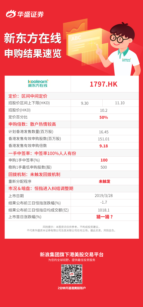 新东方在线(01797.HK)公布中签结果,超购8.18倍,每股定价10.2港元。暗盘最高涨6.27%,至10.84港元。你认为上市首日,新东方在线是涨还是跌呢?