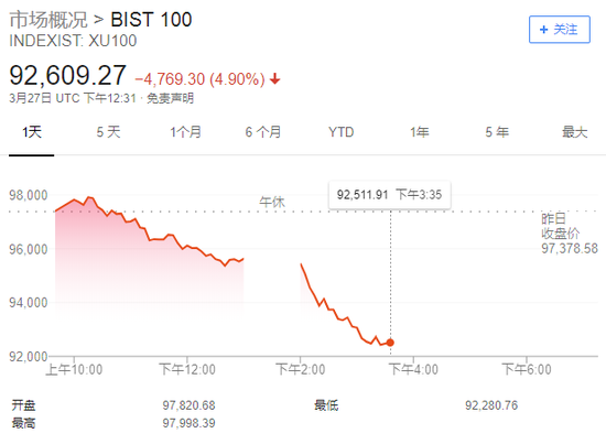 周三,土耳其股市再现动荡,Borsa Istanbul 100指数波动性升至去年11月以来最高水平,午后暴跌近5%。