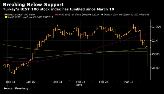 新浪美股讯 土耳其股市周三暴跌,土耳其BIST 100指数收跌5.7%,创下2016年7月以来的最大单日跌幅,几乎抹去了2019年的全部涨幅。里拉汇率再度波动,促使投资者在周日的地方选举前抛售股票。