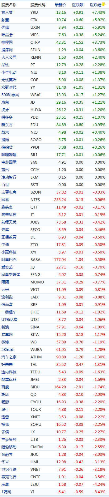 中概股多数下跌,其中4支股票涨幅超过5%,宜人贷涨7.43%报13.16美元,触宝涨5.92%报10.74美元,优信涨5.91%报3.94美元,唯品会涨5.24%报7.63美元。