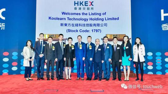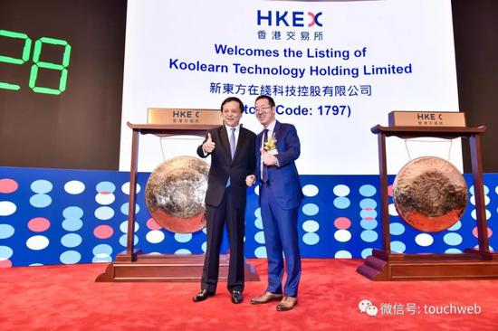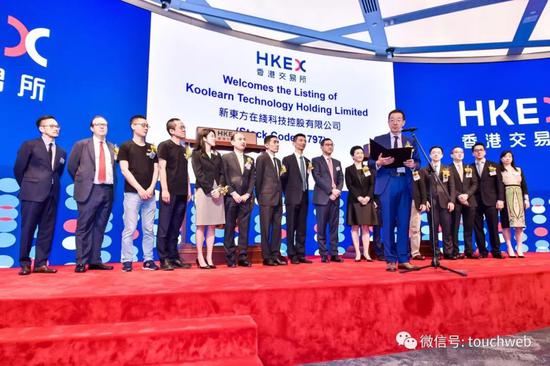 上午9点,新东方董事长俞敏洪、新东方在线联席CEO孙畅、孙东旭等多位嘉宾与港交所行政总裁李小加一起参加上市仪式。