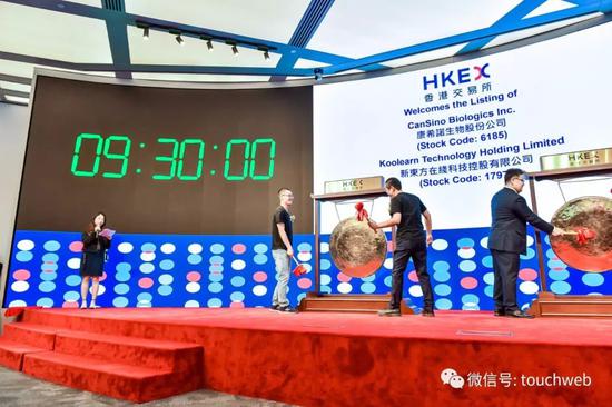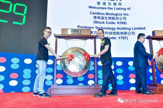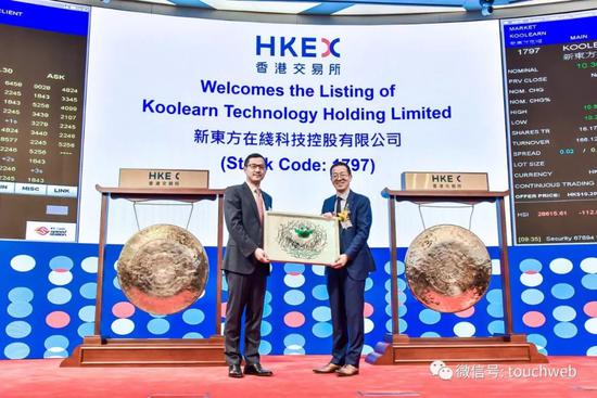 新东方在线名师代表王江涛及学员代表孙纶波,在港交所上市委员会的陪同下敲响铜锣,宣告新东方在线的股票于港交所正式开始买卖。