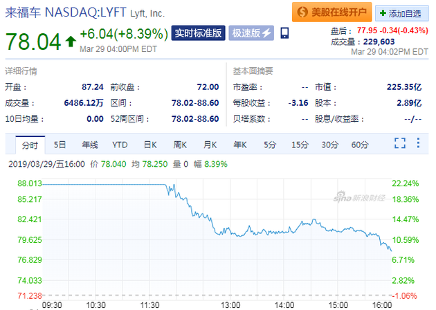 新浪科技讯 北京时间3月30日凌晨消息,“网约车第一股”Lyft今日在纳斯达克挂牌上市,股票代码“LYFT”,开盘价87.24美元,较72美元的发行价上涨21.49%。截至收盘,Lyft报78.04美元,涨幅达8.39%,市值225.35亿美元。