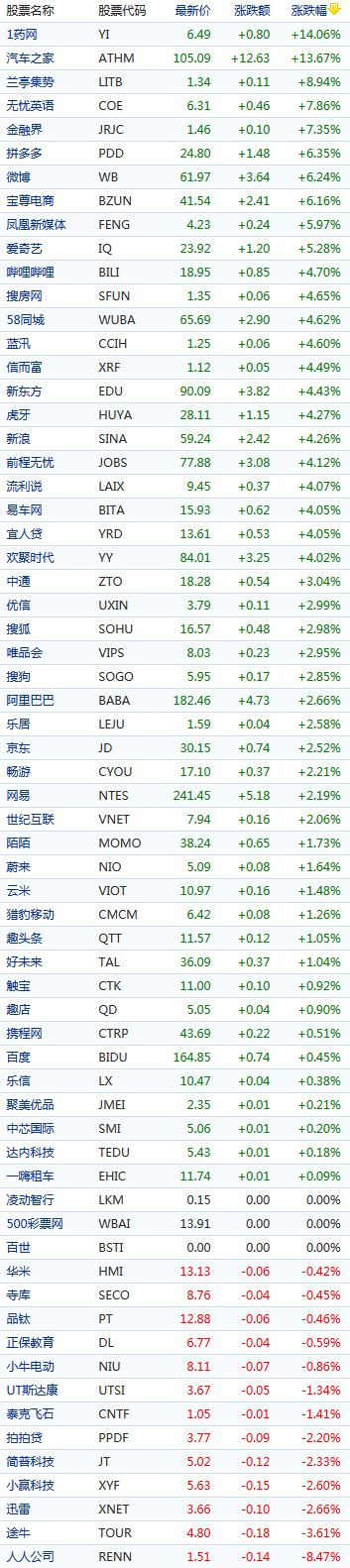 中概股周五普遍上涨,其中8支股票涨幅超过6%,1药网涨14.06%报6.49美元,汽车之家涨13.67%报105.09美元,兰亭集势涨8.94%报1.34美元,无忧英语涨7.86%报6.31美元,金融界涨7.35%报1.46美元,拼多多涨6.35%报24.80美元,微博涨6.24%报61.97美元,宝尊电商涨6.16%报41.54美元;爱奇艺涨5.28%报23.92美元,哔哩哔哩涨4.70%报18.95美元。