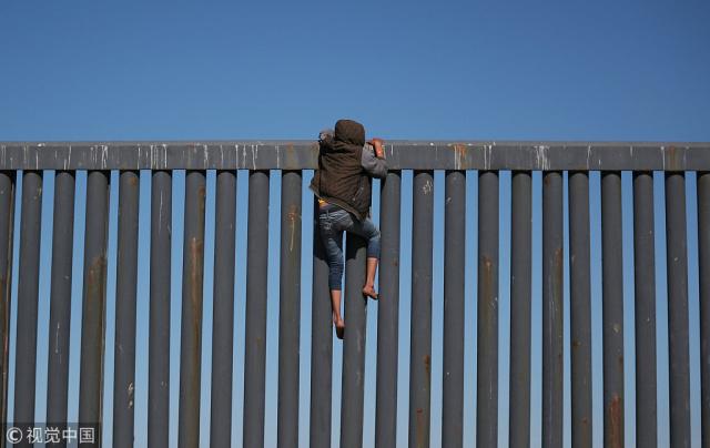 墨西哥蒂华纳,中美洲移民爬上美墨边境墙。(视觉中国)
