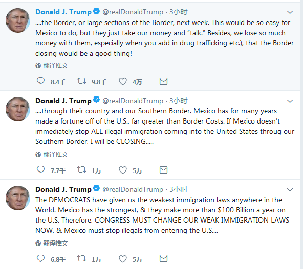 “如果墨西哥不立即行动,我将在下周关闭南部边境。”美国总统特朗普当地时间29日在推特上连发三文警告,若墨西哥不立即制止那些通过美国南部入境的非法移民,下周将会关闭南部的美墨边境。他同时批评民主党让美国的移民法变弱,要求国会立即修改移民政策。