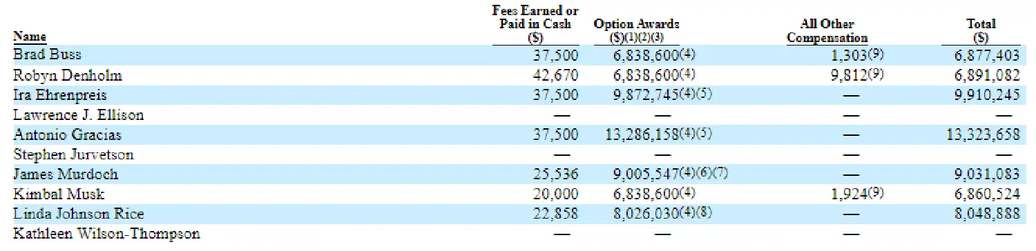 但是,如果看看特斯拉给董事会成员的薪资,或许就会发现,特斯拉之所以能在面对一系列挑战时屹立不倒,董事会拿钱到手软,或许是非常重要的原因之一。