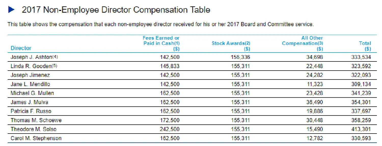 另外没有获得薪水的董事会成员分别是甲骨文公司的联合创始人兼CEO Lawrence J. Ellison,风险投资人Stephen Jurvetson以及医药公司公司沃尔格林联合博姿集团的全球首席人力资源官 Kathleen Wilson-Thompson。