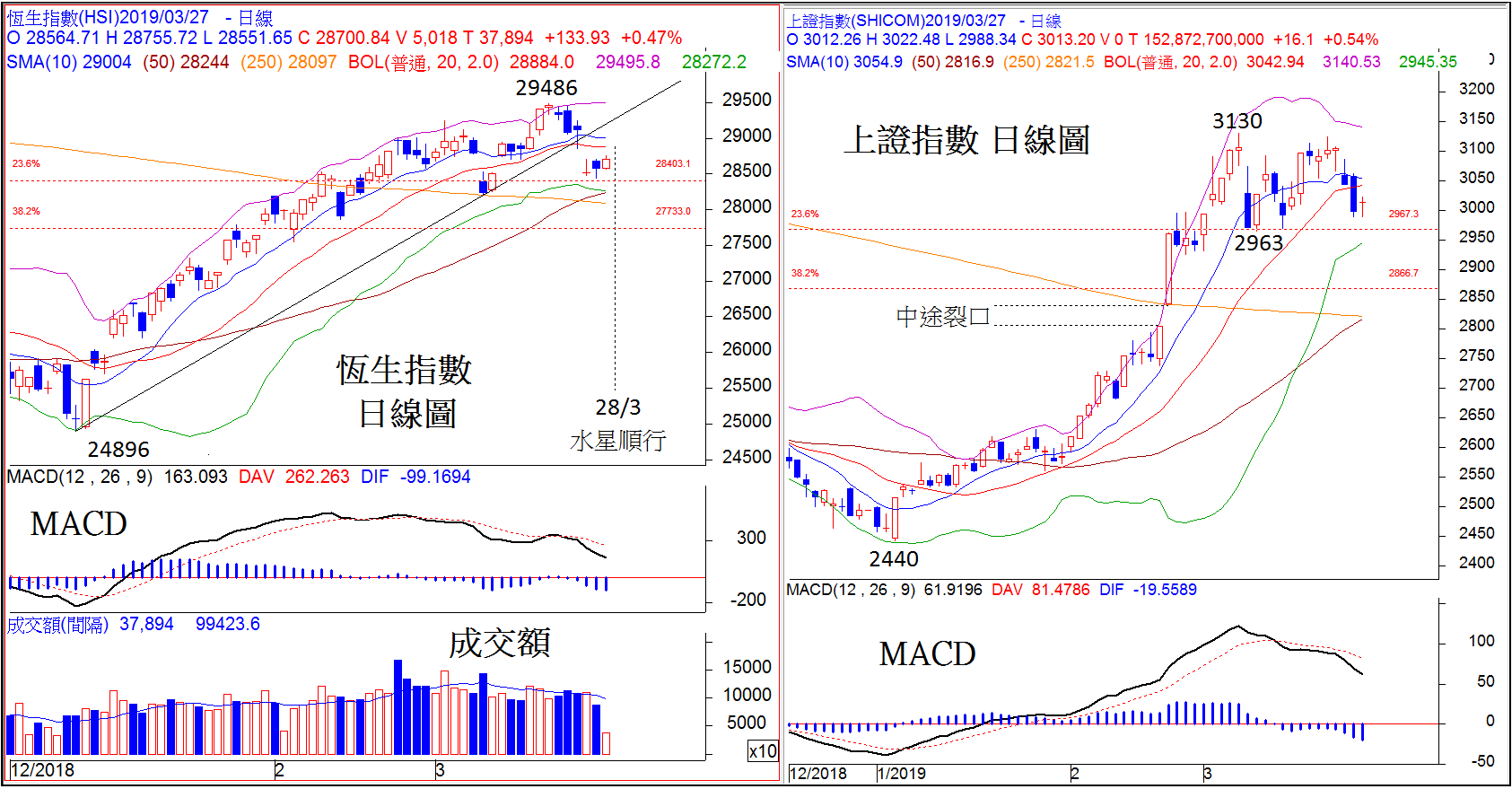 原先估計,恆指的調整最快應該在「水星逆行」於3月28日結束時見底。結果是,恆指在早兩個交易日,即3月26日的28435見底。無獨有偶,整個「水星逆行」周期由3月6日開始,及至3月15日抵達整個周期的「中間點」,然後在3月28日結束,而恆指是次調整由3月4日的29241開始,並於3月19日短暫破頂,然後在29486見頂,兩個日期都剛好與「水星逆行」周期的起點及中間點偏差兩個交易日。換言之,恆指由3月初開始的調整,剛好與是次「水星逆行」周期一起開始及結束。